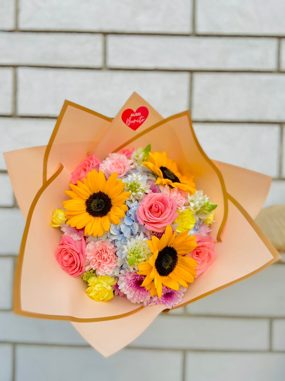 Este alegre Ramo Colorido de Girasoles y Flores Mixtas es una celebración de la vida y la alegría. Con girasoles brillantes que destacan por su color y frescura, junto con delicadas rosas, crisantemos y hortensias en una encantadora paleta de tonos suaves, este ramo crea una composición vibrante que ilumina cualquier espacio. Presentado en un elegante papel en tonos melocotón con detalles dorados, realza la belleza de cada flor.